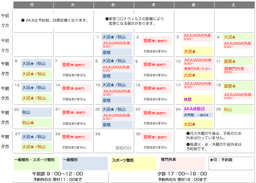 ※診療状況により担当医変更や休診になる場合がございますので、予めご了承くださいますようお願いします。