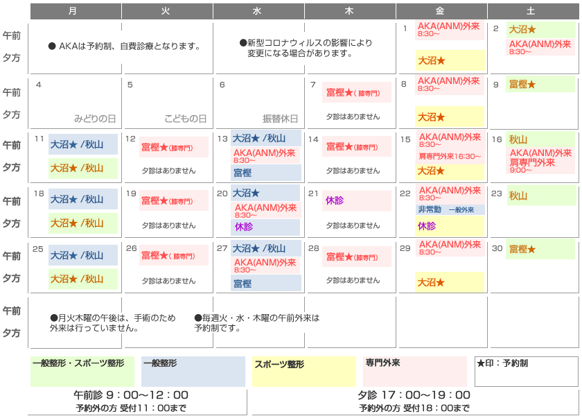 ※診療状況により担当医変更や休診になる場合がございますので、予めご了承くださいますようお願いします。